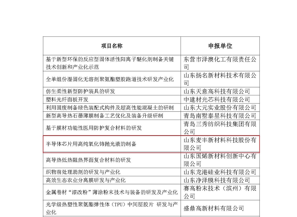 近日,山東省科學技術廳發(fā)布了《關于2021年山東省科技型中小企業(yè)創(chuàng)新能力提升工程擬立項項目公示的通知》,其中我司”半導體芯片用高純氧化鈰拋光液的制備“項目上榜!